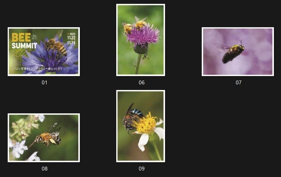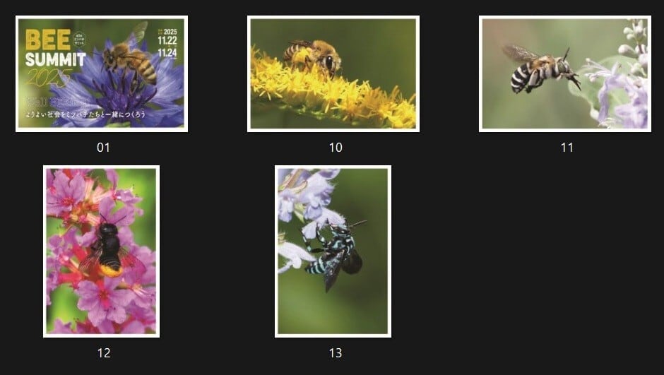 魅力あふれる日本の在来ハナバチたちを美しいフォトカードで楽しんでみませんか?このフォトカード5枚セットには、精緻な写真で捉えられた日本の在来ハナバチの作品が4枚と、特別に作製されたミツバチサミット2025の記念カードが含まれています。